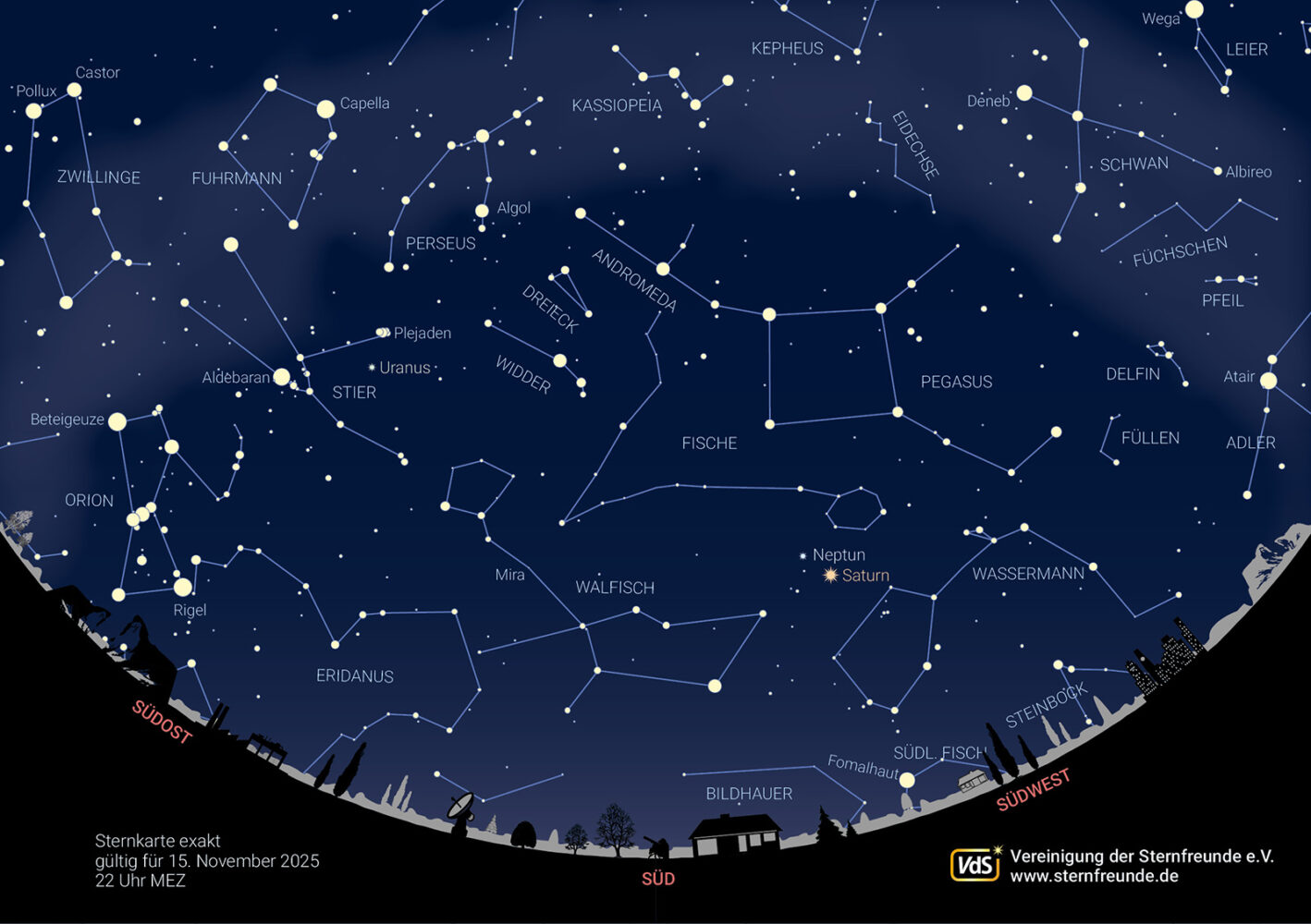 Im Osten tauchen bereits die Sternbilder des Winterhimmels mit deutlich helleren Sternen auf: Senkrecht über uns die Kassiopeia (das „Himmels-W“), zum Südosthorizont hin gefolgt vom Perseus (mit dem veränderlichen Stern Algol) und dem