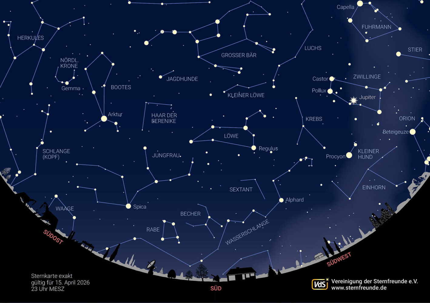 Unsere Sternkarte zeigt den gestirnten Himmel für 23 Uhr Sommerzeit. Dann wird der Sternenhimmel von den Frühlingssternbildern beherrscht. Genau in Südrichtung findet man jetzt das Sternbild Löwe, dessen Figur in der Tat an eine liegende Raubkatze erinnert. In südöstlicher Richtung sorgen zwei Lichter für Aufmerksamkeit: Spica, Hauptstern der Jungfrau, und höher am Himmel der orange Arktur im Sternbild Bootes. Arktur, Spica und Regulus spannen das sogenannte Frühlingsdreieck auf.