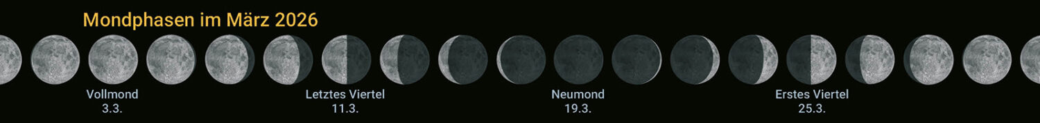 - Venus baut ihre Abendsichtbarkeit nur zögernd aus. Am 7. März zieht sie knapp an Neptun vorbei, am 8. März passiert Venus den Saturn. Am 20. März ergibt sich zusammen mit der schmalen Mondsichel ein hübscher Himmelsanblick.